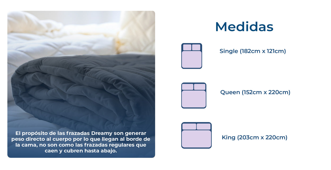 El propósito de las frazadas Dreamy son generar peso directo al cuerpo por lo que no llegan al borde de la cama, no son como las frazadas regulares que caen y cubren hasta abajo.